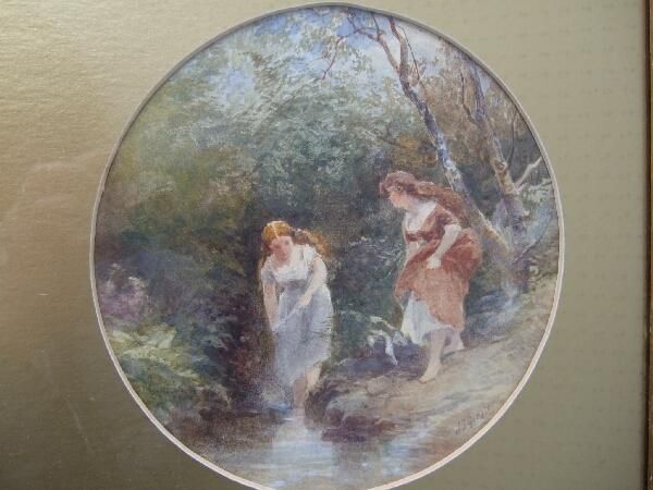 Study of two young ladies paddling in a stream, in woodland setting,