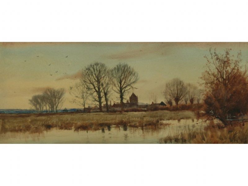 a river and marshland with autumnal trees and buildings beyond,