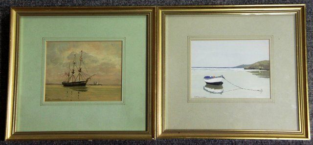 Boat Anchored on Beach and Square Rigged Ship Moored