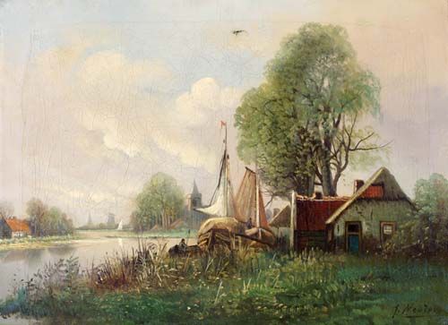 Flusslandschaft mit Häusern und angelegtem Fischerboot