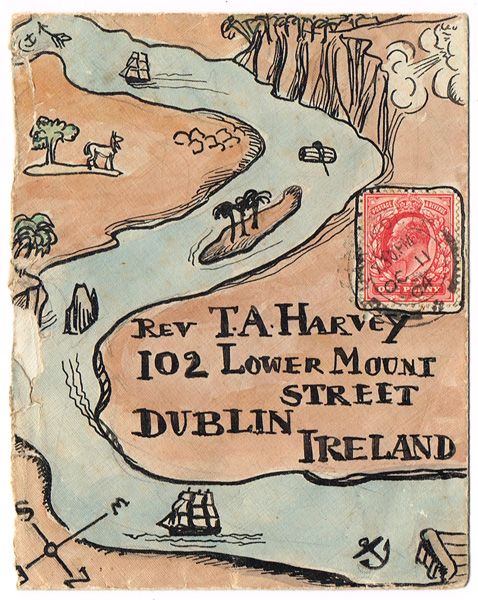 | ILLUSTRATED ENVELOPE FROM JACK B. YEATS TO REV. T.A. HARVEY, SHOWING CHART OF PIRATE ISLAND | |
