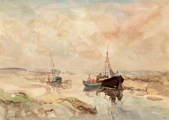 North Norfolk River Estuary Scene with Fishermen and Boats,