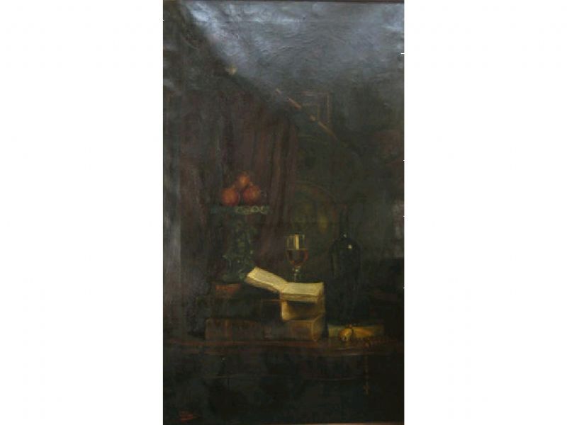 | Still life of books, a glass, a wine bottle and other items on a table | |