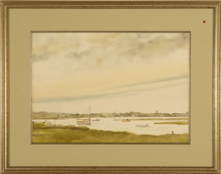 Oyster Pond, Chatham, with moored boats and steeples in distance.
