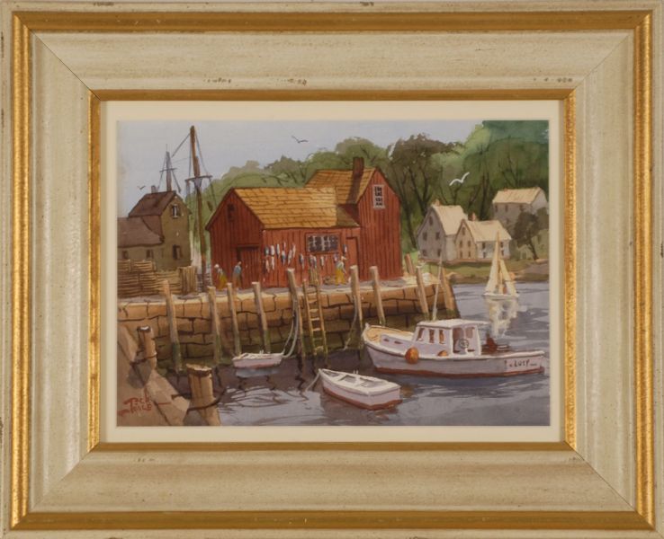 North Shore fishing dock with figures, buildings and moored vessels.