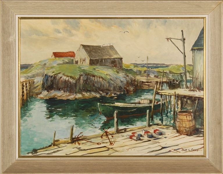 Dock scene with fishing boats, shanties, buoys and anchors.
