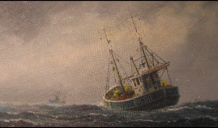 Fishing vessels on rough seas, trawler BK911 in the foreground