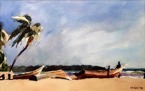 SALT AIR; FIGURES IN FRONT OF A HUT, A MOUNTAIN BEYOND