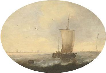 | Shipping in a stiff breeze, a coastline with a town beyond, in a painted oval | |