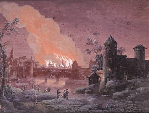 | A coastal landscape with shipping at anchor; A moonlit riverside town in flames | |