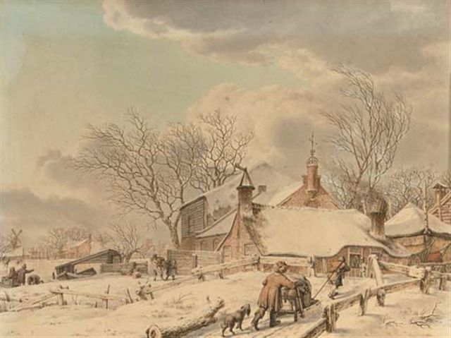 | A winter landscape with farmers gathering wood, skating and pulling a sledge on a path near a farm | |