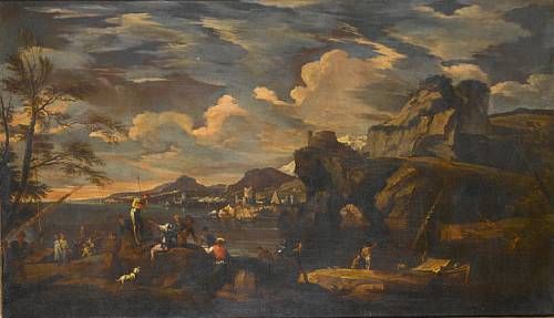 A Mediterranean coastline with figures resting on rocks in the foreground