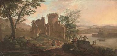 A river landscape with travellers by a ruined fort