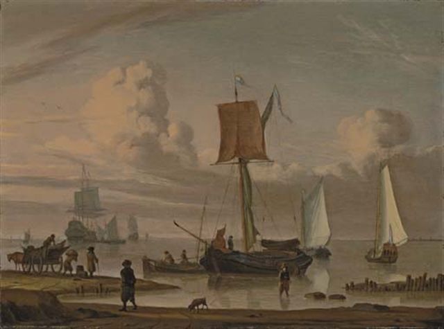 | Dutch shipping by a shore with figures unloading a wagon | |