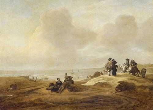 | Fisherfolk and elegant figures in a dune landscape, possibly Scheveningen, a coastal inlet beyond | |