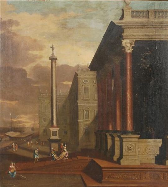 | A port scene, with figures by a portico and an Italianate palace beyond | |