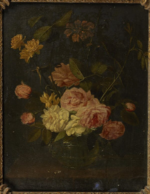 | A floral still life depicting a group of roses & other herbaceous flowers in a vase | |