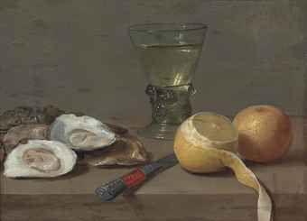 | Oysters, a roemer, a partly peeled lemon, an orange and a knife on a stone ledge | |