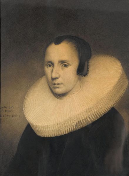 Brustbildnis einer älteren Dame mit Mühlsteinkragen.