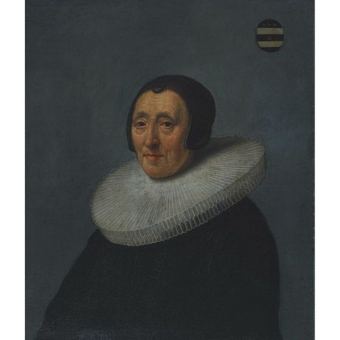AN ELDERLY WOMAN IN A CARTWHEEL RUFF WITH COAT OF ARMS