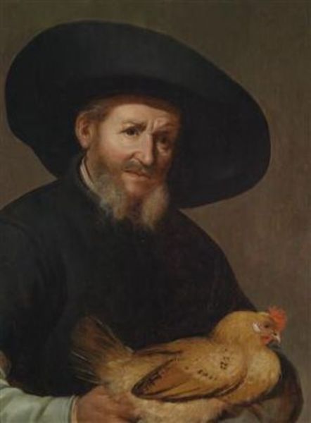 | Portrait of a bearded man in a hat and black cloak holding a cock | |