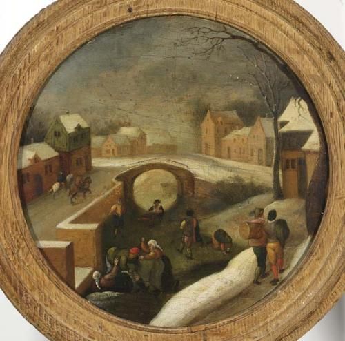 A WINTER SCENE WITH SKATERS ON A FROZEN CANAL IN A VILLAGE