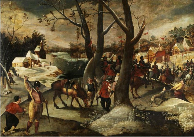 GEHARNISCHTER REITERTRUPP IN VERSCHNEITER BAUMLANDSCHAFT