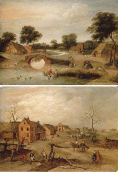 | Summer: A landscape with peasants dipping sheep in a river; and Winter: A village scene with peasants felling trees | |