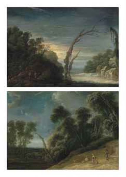 | A wooded, river landscape with a watermill and a bridge; and A wooded landscape with a shepherd and other figures on a path in t | |