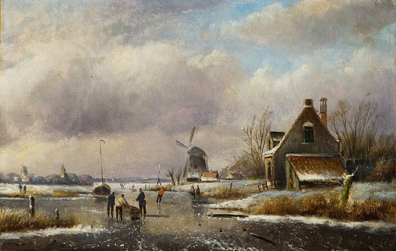 Verschneiter, zugefrorener Kanal mit Eisläufern und Bauern