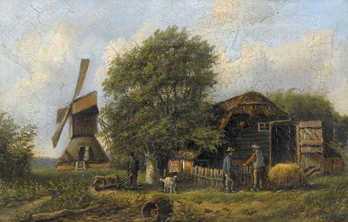 Windmühle bei Gehöft mit Figurenstaffage