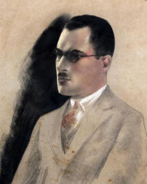 | Portrait of a young man, half length, wearing a grey suit and red tie and spectacles | |