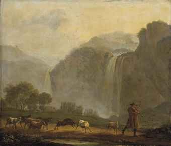 | A mountainous landscape with a shepherd and his flock on a track before a waterfall | |