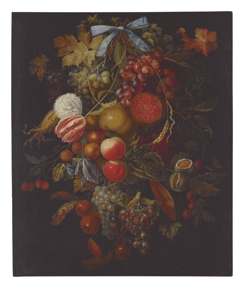 | STILL LIFE OF A HANGING BOUGH OF FRUIT AND FLOWERS INCLUDING GRAPES, PEACHES, FIGS, CORN, POMEGRANATES, CARNATIONS, AND TULIPS | |