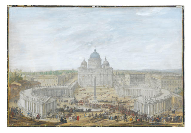 | A view of St Peter's, Rome, with bystanders watching a papal procession leaving the piazza | |