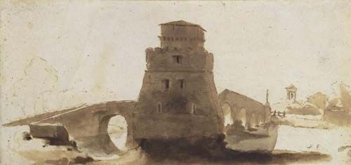 | Pen and ink drawing in brown, with brown and grey wash | |