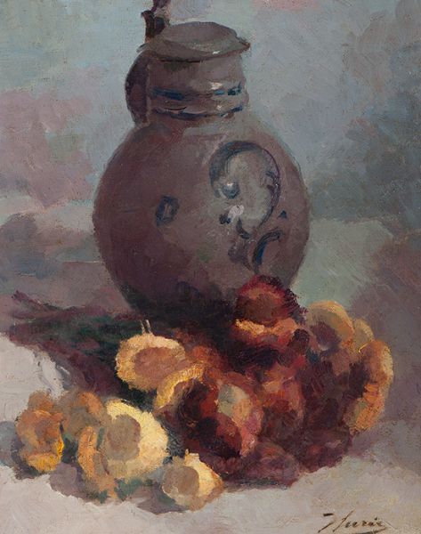 Stilleven met Duitse kruik met tinnen klepdeksel en droogbloemen
