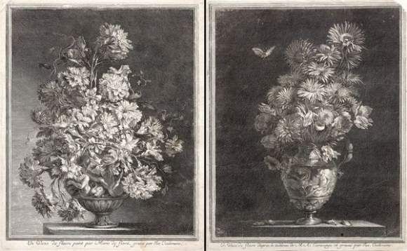 Paire de gravures au burin : Vase de fleurs d'après Caravage