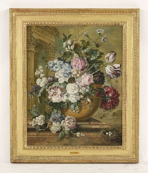 | STILL LIFE WITH SUMMER FLOWERS IN A BOWL ON A MARBLE LEDGE, WITH BIRDS'-EGGS AND INSECTS, A CORINTHIAN COLUMNED TEMPLE BEYOND | |
