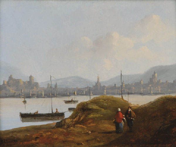 | Voorstellingen van steden aan een rivier met schepen en figuren op de voorgrond | |