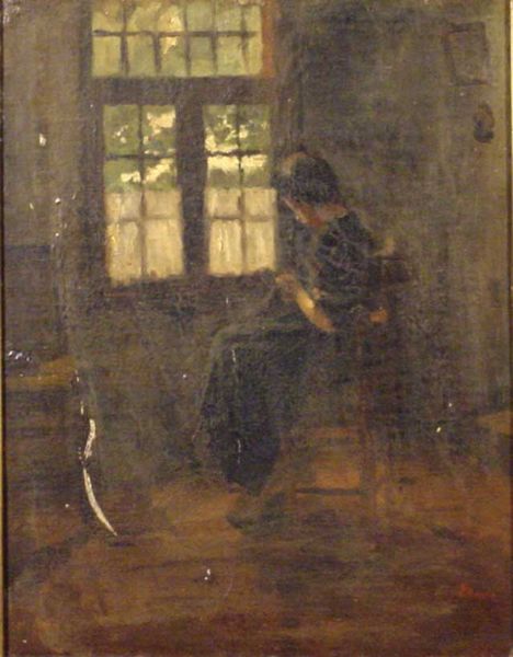 | Sewing girl in front of a window through which the sunlight enters | |