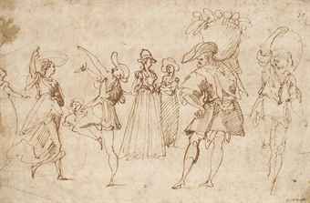 | A sheet of figure studies: A man and woman dancing, two elegant ladies, and two men carrying baskets on their shoulders | |