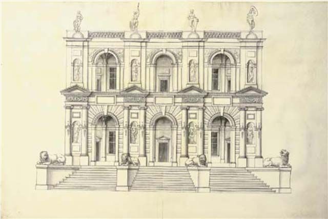 | A portico of two stories in the Ionic Order above a flight of steps, the bays divided by niches containing female figures, the w | |