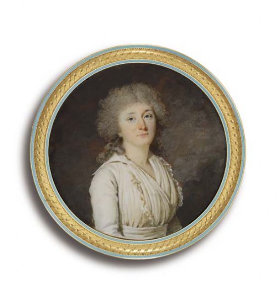 | A young lady, in white dress with lace-bordered fichu tucked into white sash, long powdered curling hair | |