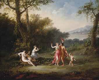 | A wooded landscape with nymphs music making and dancing | |