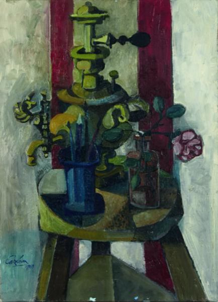 Nature morte au samovar, vase de fleurs et pot à pinceaux