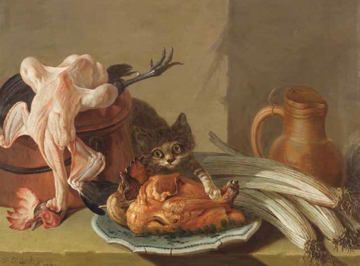 | Küchenstillleben mit junger Katze, an einem gebratenen Hähnchen naschend | |
