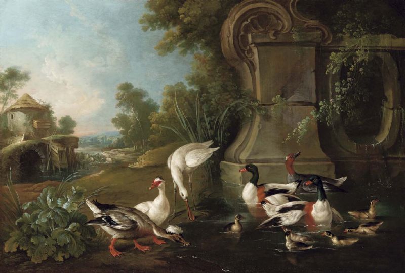 Fontana con anatre, anatroccoli e altri volatili in un paesaggio