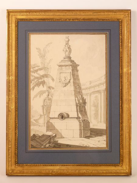 | AN ARCHITECTURAL CAPRICCIO WITH A CLASSICAL MONUMENT OF OBELISK FORM, SURMOUNTED BY THE THREE GRACES SUPPORTING AN EWER | |