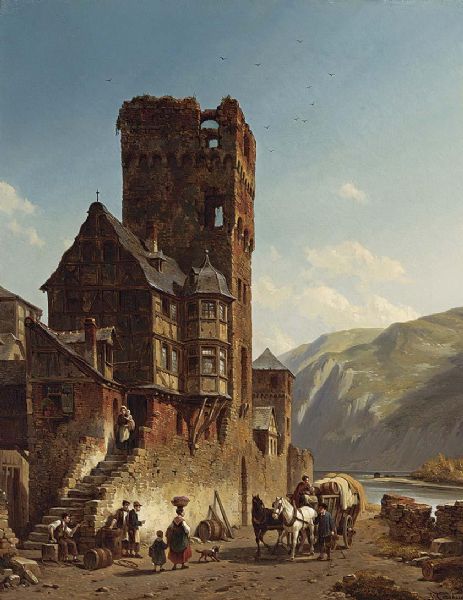 A BUSY STREET SCENE IN A RIVER SIDE TOWN